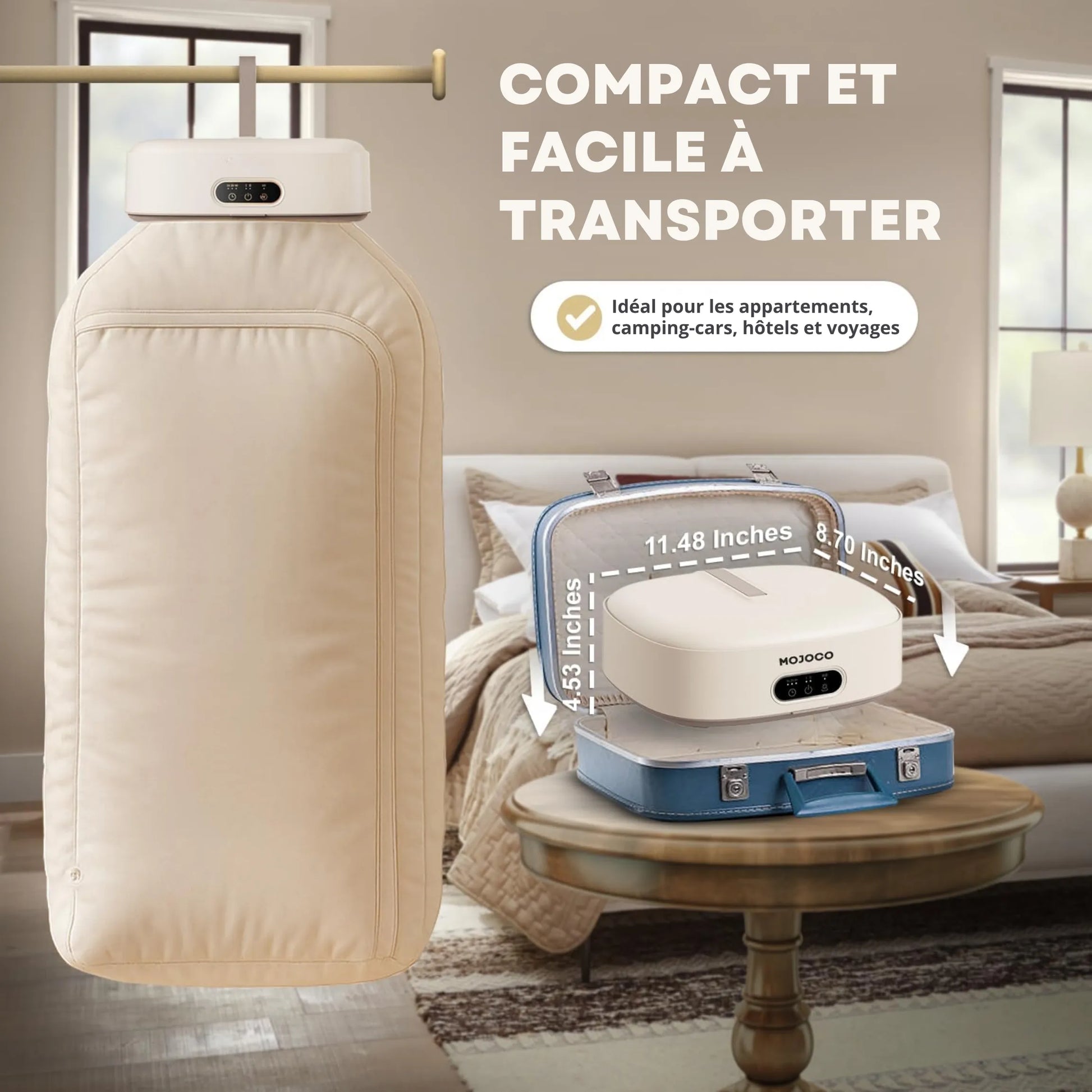 Cette sécheuse portable est géniale ! La télécommande est très pratique et le séchage à air chaud respecte bien les tissus. La minuterie est un vrai plus. Compacte et parfaite pour notre appartement. Je recommande vivement!